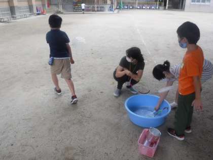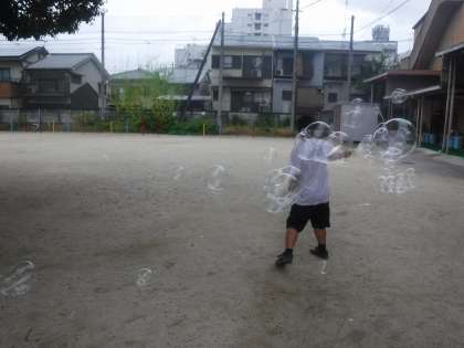 コロナ禍で息を使ったシャボン玉遊びはできませんでしたが,ハンガーで作った輪っかや,うちわの骨組みを使って,運動場でたくさんのシャボン玉を飛ばしました。