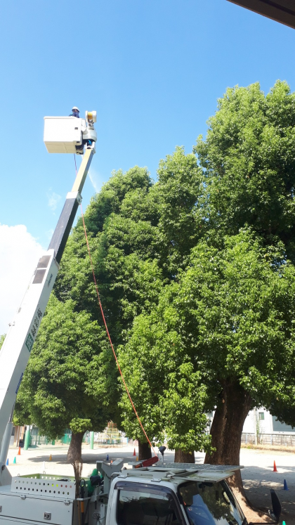 校庭のクスノキに薬剤散布を行いました。今週に入って「イラガ」がずいぶん増えたためです。