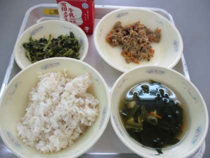 今日の献立は,ごはん,すましじる,だいこん葉のごま炒め,おからサバどんぶりの具,牛乳です。