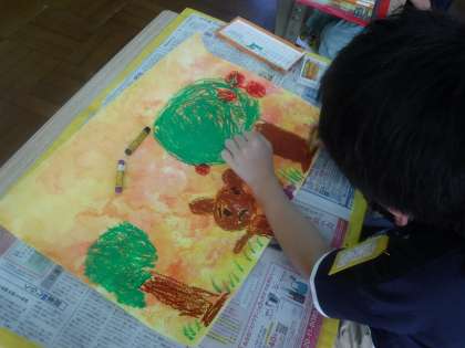 「くまのこるうくんと おばけのこ」をの本を読んで,先週描いた背景の上に今日は登場人物を描きました。
