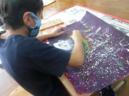 「夜の場面の『くまのこ』と『おばけのこ』は,やっと出会えて嬉しそうだったな。」など,気持ちを考えながらその時の表情を想像しながら描いていました。
