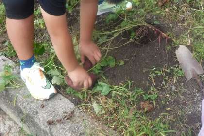 土からのぞくさつまいもの周りを掘ったり,つるをひっぱると,いくつも連なって一気にたくさんのさつまいもが収穫できました。