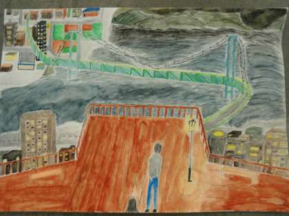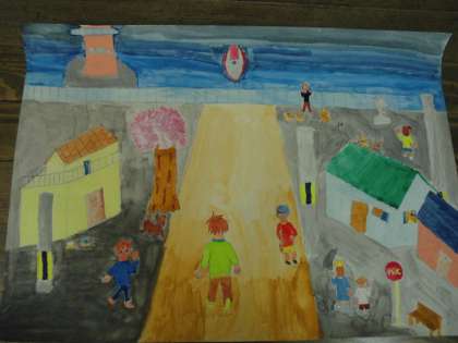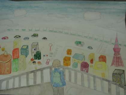 「小さな神たちの祭り」のお話をもとに,想像を広げて絵を描きました。細部までこだわり町の様子を表現することができています!