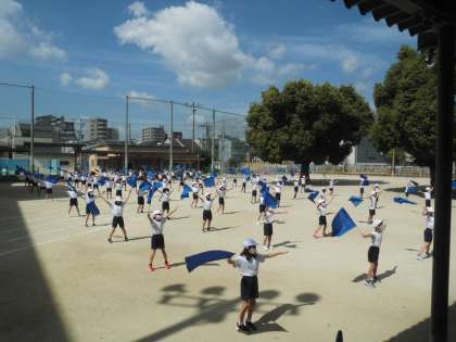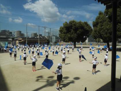 久しぶりの学年での集まり。子どもたちは元気にフラッグの練習をしました。