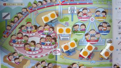 乗り物に乗っている子どもに数図ブロックを置いて,何人いるのか確かめながら,かけ算のはじめの学習をしました。
