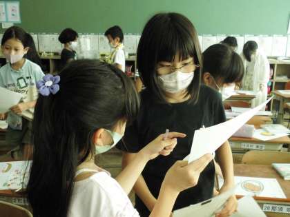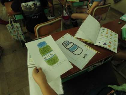 配られた色カードと食べ物カードを合わせて,その食べ物を絵に描きました。「green」と「milk」のカードをもらった児童は緑の牛乳の絵を描き,友達に,「Do you like green milk?」と尋ねていました。