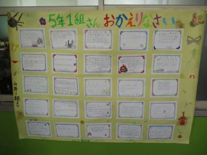 今日は,山の家から帰ってきて早速の学校生活でしたが,朝教室まで来ると,模造紙いっぱいに4年生からの手紙がありました。
