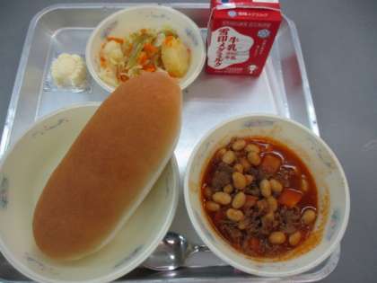 今日の献立は,コッペパン,大豆と牛肉のトマト煮,野菜のホッとマリネ,かたチーズ,牛乳です。