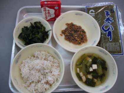 今日の献立は,むぎごはん,すまし汁,ほうれんそうのおかか煮,肉みそ納豆,手巻きのり,牛乳です。
