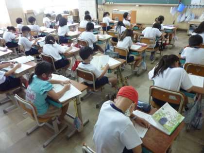 音読もだんだん上手になってきました。今回は,お手紙の2つの絵を比べて,「がまくん」と「かえるくん」が並んで座っている様子やどんな話をしているのかを思い浮かべました。