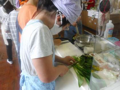 野菜の切り方を一緒に確認したり,「小松菜の切り方が上手だね。」と褒めてもらったり,みんなで楽しく調理することができました。