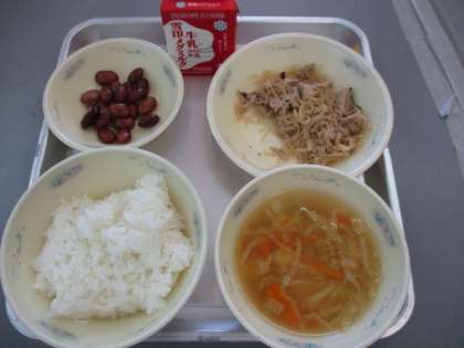 今日の献立は,ごはん,キャベツの吉野汁,金時豆の甘煮,ぶた肉とこんにゃくのいため煮,牛乳です。