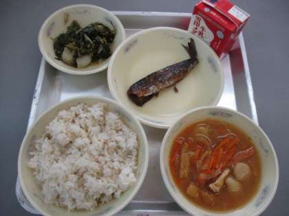今日の献立は,むぎごはん,いものこ汁,ほうれんそうと白菜のごま煮,いわしのしょうが煮,牛乳です。