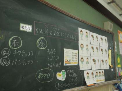 「こころひとつの日」の取り組みで,「隣の国,韓国・朝鮮の食べ物,服,歌,遊びなどを知り,それぞれの国の文化のよさに気づく」というねらいで学習しました。