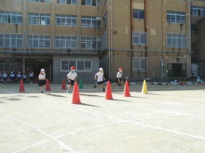 コーンをくるくる回り,体育科の「とびあそび」で学習した箱をとびました。最後まで頑張って走ることができました。