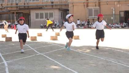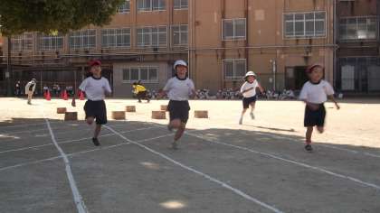 1年生の障害物競走の様子です。コーンを回り,フープをくぐって,箱を跳びました。