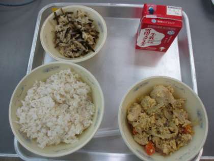 今日の献立は,むぎごはん,厚揚げのチャンプル,クーブイリチー,牛乳です。