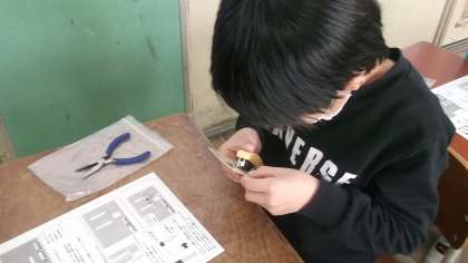 生き方探求館の方を招いてモノづくり体験学習をしました。まず,最初に京都のモノづくりの技術について学び,その後,太陽光電池を利用した「音を奏でる不思議な石ころ」を作製しました。子どもたちは,初めて見る電子部品に興味津々。みんな真剣に組立てていました。