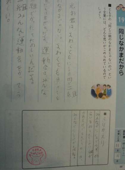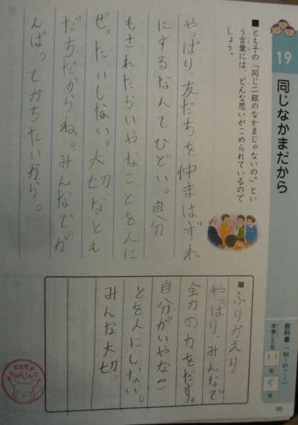 今日の特別の教科道徳は「同じなかまだから」というお話を通して,「仲間を大切にする」ということについて考えました。