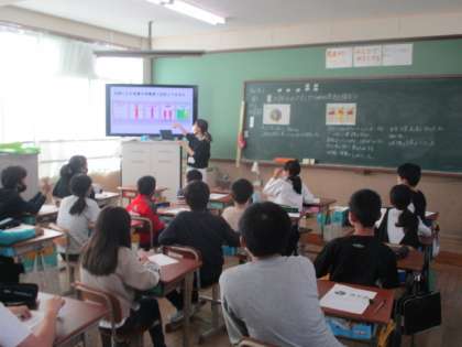 今日の学活の学習では,「栄養バランス」について,食の指導の先生と一緒に学びました。授業では,栄養バランスの偏った数日の食事を見て,何の栄養が多いのか少ないのかを交流し,出た考えを基に,これからどう改善すればよいかを考えました。