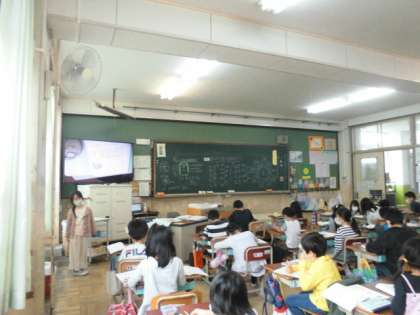 最後に,8の段の問題作りにも取り組みました。自分で,8の段の九九で解くことのできる問題を書いたり,問題の絵もかいたりしました。そして,問題を書いたノートを書画カメラでTV画面に映して,発表しました。「どんな式になるでしょう。」とみんなに問いかけて,答えるのをみんな楽しんでいました。