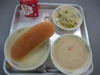 今日の献立は,コッペパン,チャウダー,ハムサンドの具,マヨネーズ,牛乳です。