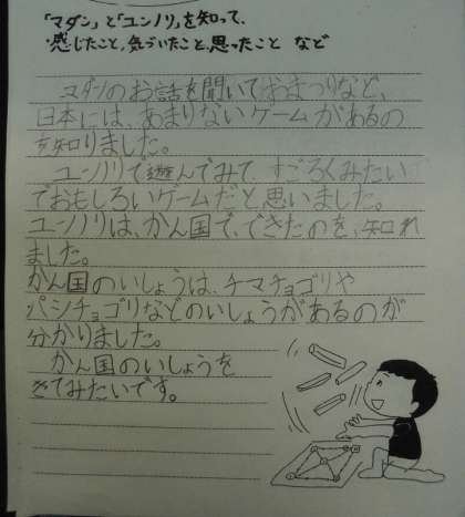 韓国朝鮮の文化の一つとして,「ユンノリ」という遊びにも挑戦しました。「ユンノリ」は日本のすごろくと似ているのですが,さいころの代わりに半円形の木材4本を投げて進む目の数を決めます。今日はグループ対抗でゲームをしましたが,楽しくユンノリに取り組んでいました。