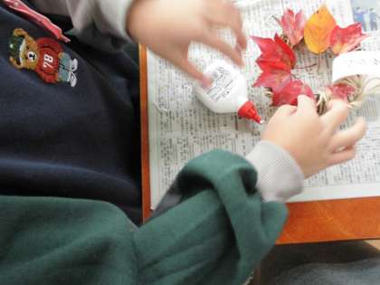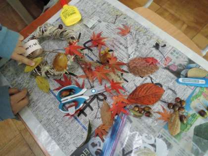 色のきれいな葉っぱや団栗などを付けたり,家から持ってきたリボンや綿を付けたりしました。