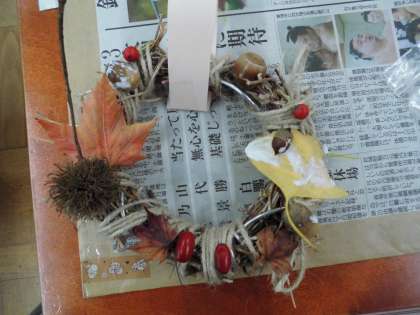 先日朝顔のつるで作ったリースに,今日は飾り付けをしまいした。