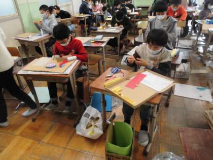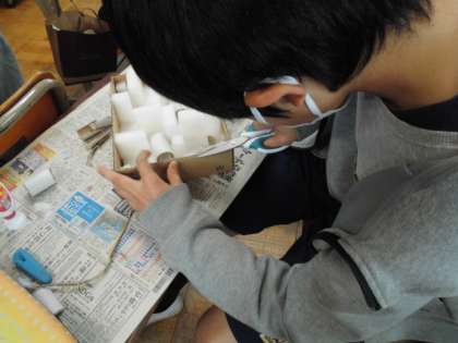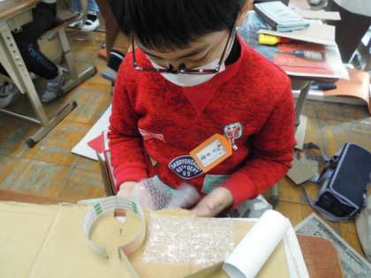 「わくわくプレイランド」では,だんボールや,紙のつつを使って「ビー玉のぼうけん」の作製をしています。だんボールカッターを使って,切り分けたり組み立てたりして,楽しく遊ぶものを作り上げます。みんな次回の時間が楽しみと感想を発表していました。