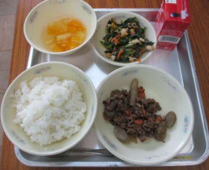 今日の献立は,ごはん,牛肉とごぼうの煮つけ,ほうれんそうの煮びたし,フルーツ寒天,牛乳です。