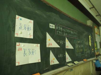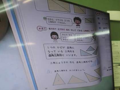 最後に,「一つの角が直角になっている三角形を直角三角形といいます。」ということを学習しました。みんな,切ったり,重ねたり,角を三角定規で調べたり,がんばって学習に取り組んでいました。