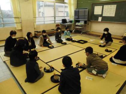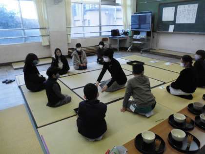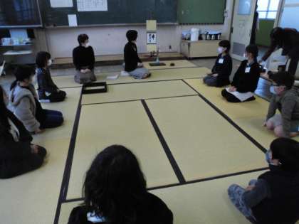 裏千家の先生にお越しいただき「道具の運び出し」「道具を清める」「お茶を点てる」「しまいつけをする」「道具を拝見に出す」の手順をご指導いただきました。軸には清水寺管主直筆の「牛」。茶花には「綿と椿」でクリスマスをイメージ。張り子牛の置物。と凛とした中にも温かい茶会を楽しむことができました。