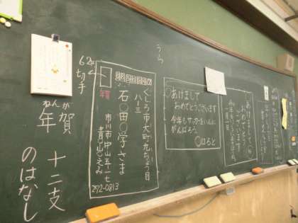 2年生は,書写の時間に,年賀状の書き方を学習しました。