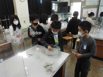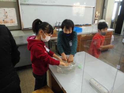 理科で「ものの温度と体積」の学習をしました。ペットボトルを用意し,冷たい水につけた場合と,お湯につけた場合にどのような変化がでるか調べました。