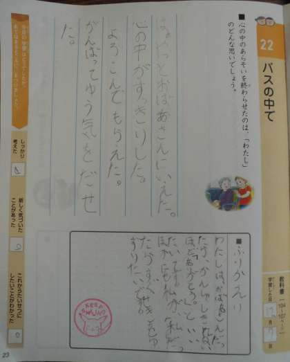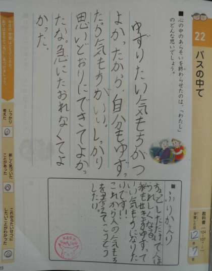 今週の特別の教科道徳は「バスの中の」のお話を通し,「相手を思いやる心」について考えました。