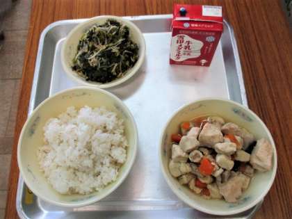 今日の献立は,むぎごはん,高野どうふと野菜の炊き合わせ,ほうれんそうともやしのごま煮,牛乳です。