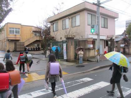 あいさつ運動も今日が最終日。傘をさしての呼び掛けです。