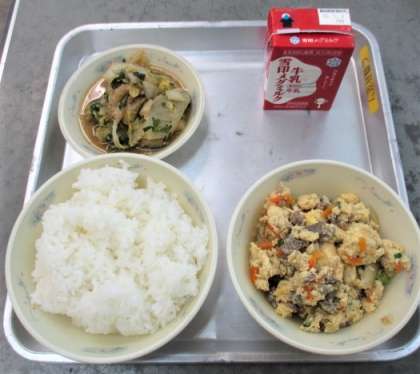 今日の献立は,ごはん,他人煮,春菊とはくさいのごま煮,牛乳です。