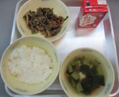 今日の献立は,ごはん,とうふと青菜のスープ,プルコギ,牛乳です。