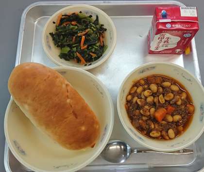 今日の献立は,おさつパン,チリコンカーン,ほうれんそうのソテー,牛乳です。