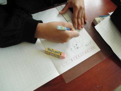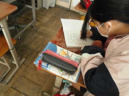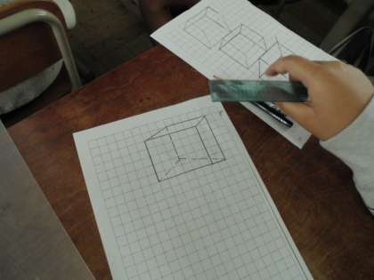 算数科では「角柱と円柱」の学習を進めています。「底面や側面」「頂点,辺」と学習を進めてき,本日は見取図をかきました。方眼をうまくつかって,「2つの底面の対応する辺」を平行にきちんとかくことを意識しました。なかなかはじめはうまくかけませんでしたが,練習を重ねかくことができました。見えない辺があることなど,たくさんの発見をすることができました。
