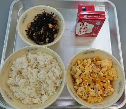 今日の献立は,むぎごはん,おやこ煮,ひじきまめ,牛乳です。
