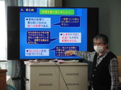 学校薬剤師の鄭先生に,薬物の恐ろしさについて様々な面から教えていただきました。近年,薬物を勧められる年齢が低年齢化しており,小学校高学年から中学生の子どもたちが狙われることが多いそうです。手口が巧妙化していて,お菓子やジュースに混ぜて飲まされたり,サプリだと偽って進められることも多くあるということでした。