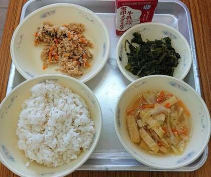 今日の献立は,むぎごはん,キャベツの吉野汁,ほうれんそうのおかか煮,おからツナどんぶりの具,牛乳です。