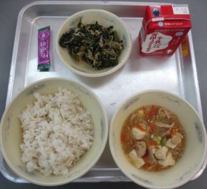 今日の献立は,むぎごはん,鶏肉と豆腐の葛煮,ほうれんそうともやしのごま煮,ふりかけ(しそ),牛乳です。