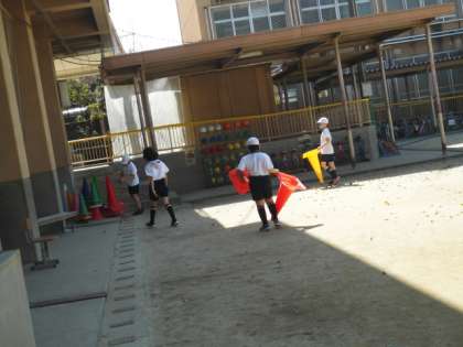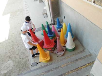 体育科の学習は,運動だけなく,チームで作戦を話し合ったり,準備や片付けを丁寧に行ったりすることも,大切にしています。学習の最後には,使った道具を元あった場所へ丁寧に戻していました。