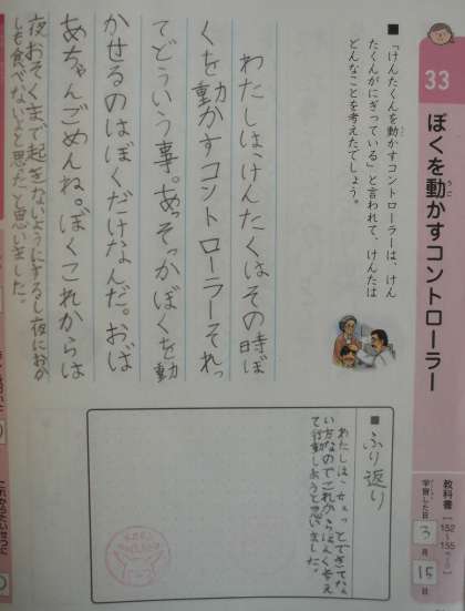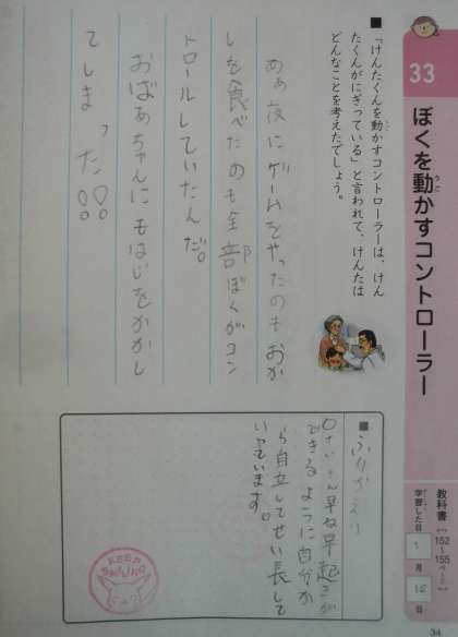 けんたくんは今朝寝坊をしてご飯も食べずに,心配そうに声をかけてくれるおばあちゃんのことも気にせず,学校へ出発しました。しかし,2時間目の途中でお腹が痛くなり,目の前が真っ暗になり,椅子に座っていられないほどになりました。保健室で寝ていると,おばあちゃんが迎えに来てくれ,病院へ連れて行ってくれました。病院の先生に昨日夕べ遅くまでゲームをしていた自分の行動を当てられ,「私が気が付かなくて。」と謝るおばあちゃんに病院の先生は,「どうしておばあちゃんがあやまるのかな。けんたくんを動かすコントローラーは,けんたくんがにぎっているんだよ。」と話されました。