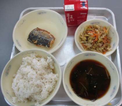 今日の献立は,むぎごはん,あかだし,キャベツのゴマ煮,さわらの竜田揚げ,牛乳です。