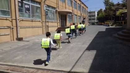1年生はしばらくの間,コースに分かれて集団下校をします。くすのきの木の下でコースごとに並び確認した後,先生達と下校します。